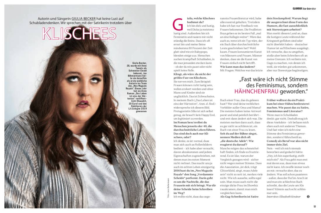 Autorin und Sängerin Giulia Becker hat keine Lust auf Schubladendenken. Wir sprechen mit der Satirikerin trotzdem über Klischees30. September 2019 GLAMOUR 2019hier lesen Ähnliche Beiträge
