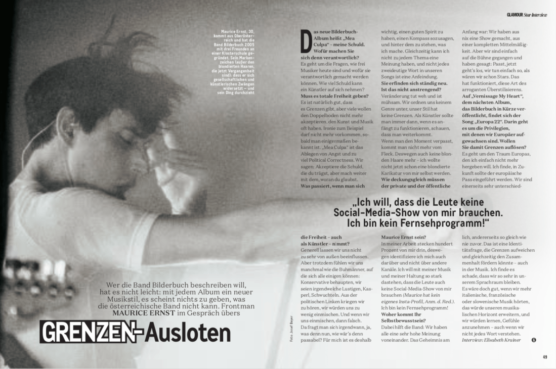 Wer die Band Bilderbuch beschreiben will, hat es nicht leicht: mit jedem Album ein neuer Musikstil, es scheint nichts zu geben, was die österreichische Band nicht kann. Frontmann Maurice Ernst im Gespräch übers Grenzen-Ausloten29. September 201929. September 2019 GLAMOUR 2019hier lesen Ähnliche Beiträge